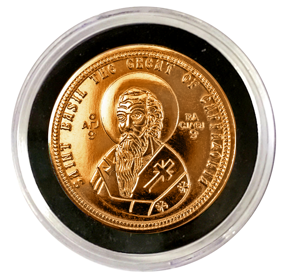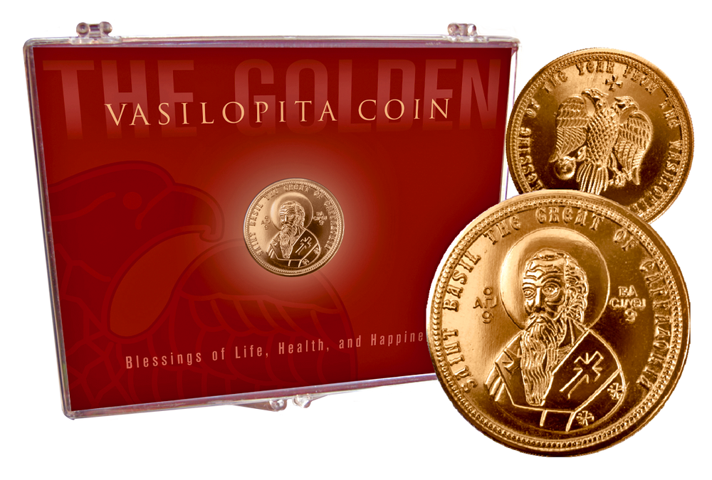 Vasilopita Coins were designed and minted by Fr. George L. Papadeas. who strongly felt that wrapping a 25¢ coin in foil to hide in the Vasilopita, minimized the reward to those few that would receive the coin as a token keepsake for life. Nothing suits the tradition better than a Brilliant Gleaming Golden Coin with the image of St. Basil on the front and the image of the two-headed Eagle, one of the most important symbols of the Byzantine Empire on the reverse side, as practiced by the Byzantine and Holy Roman Empires.